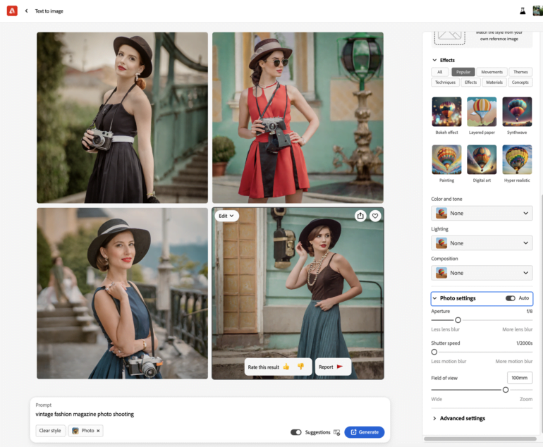 - Foto und Kunst: Firefly 2 unterscheidet automatisch oder manuell zwischen Kunst-Prompts und Foto-Prompts. Letztere bietet höhere fotorealistische Bildqualität und lässt kameraähnlich Tiefenschärfe, Bewegungsunschärfe und Sichtfeld anpassen