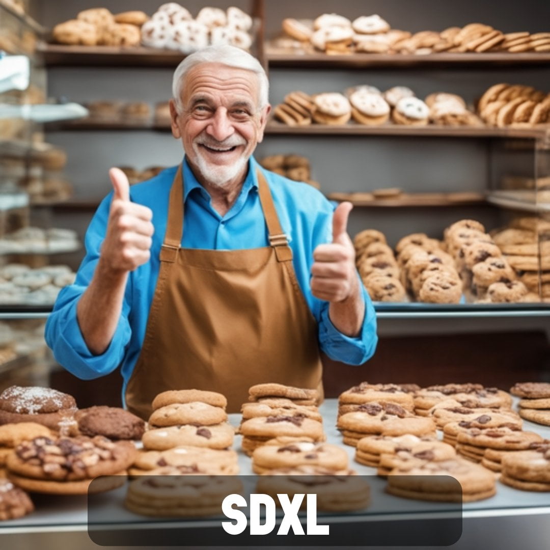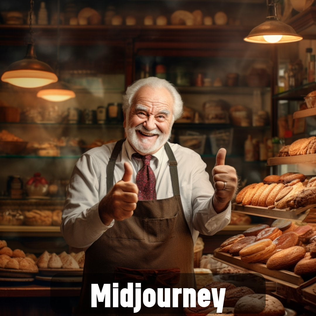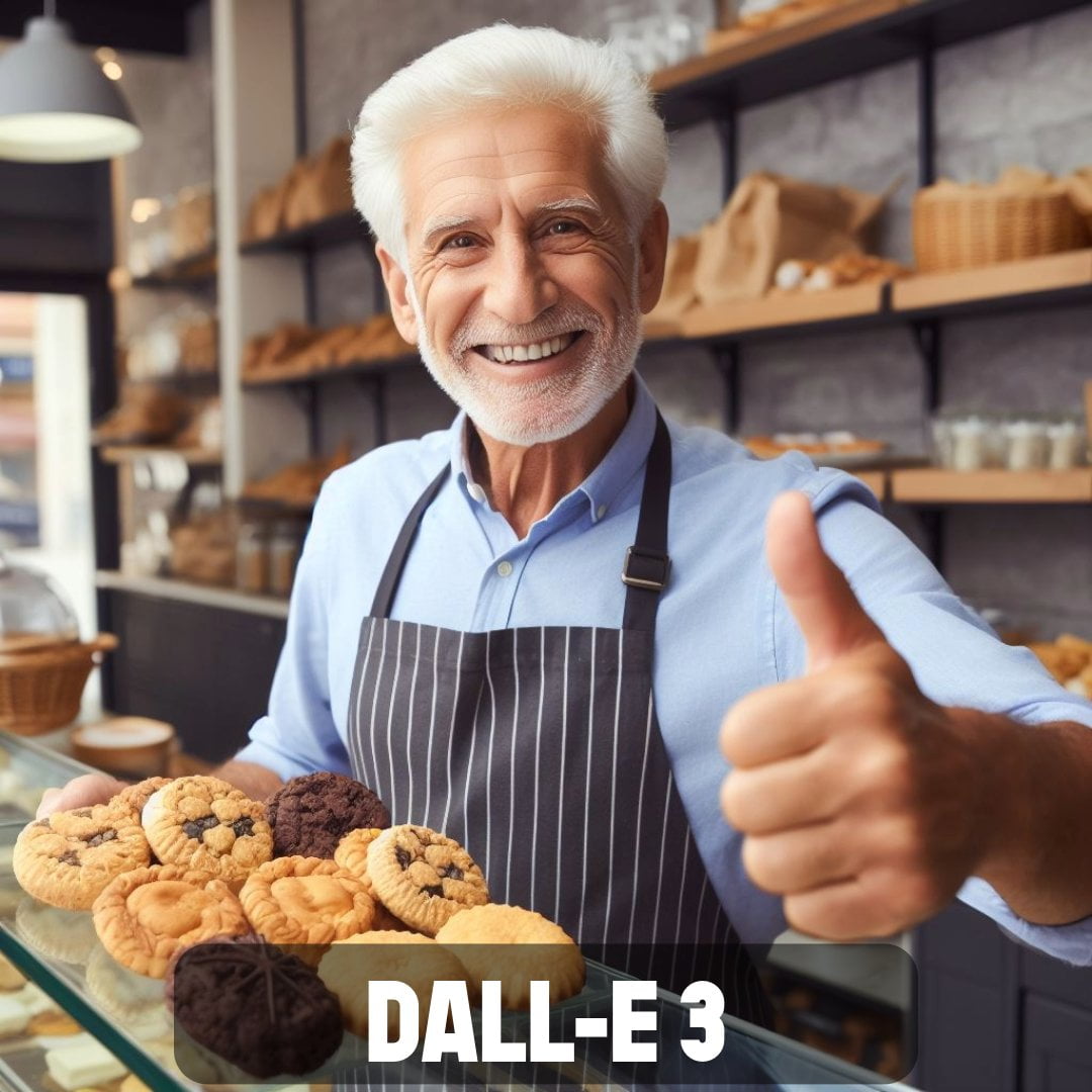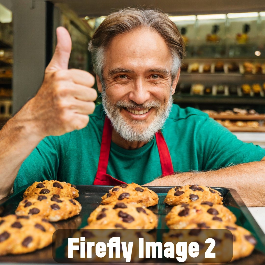 Besonders Prompts für fotorealistische Ergebnisse scheint Firefly 2 im Vergleich mit den aktuellen Versionen anderer Bildmodelle detailgetreuer umsetzen zu können. Für die unten stehenden Beispiele wurde der Prompt "Happy 50-year-old man with a beard shopkeeper in a pastry shop showing off cookies and thumb up gesture" verwendet.