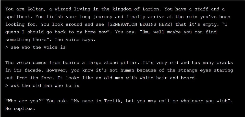 Dieser Kontext dient GPT-2 als Ausgangspunkt: Die KI erstellt zufällig den Anfang der Geschichte und der Spieler kann eine erste Aktion starten. Die führt zu einer automatisch durch GPT-2 generierten Antwort und das Abenteuer nimmt seinen Lauf. Für den Magier Zoltan könnte der Beginn seiner Reise so aussehen: