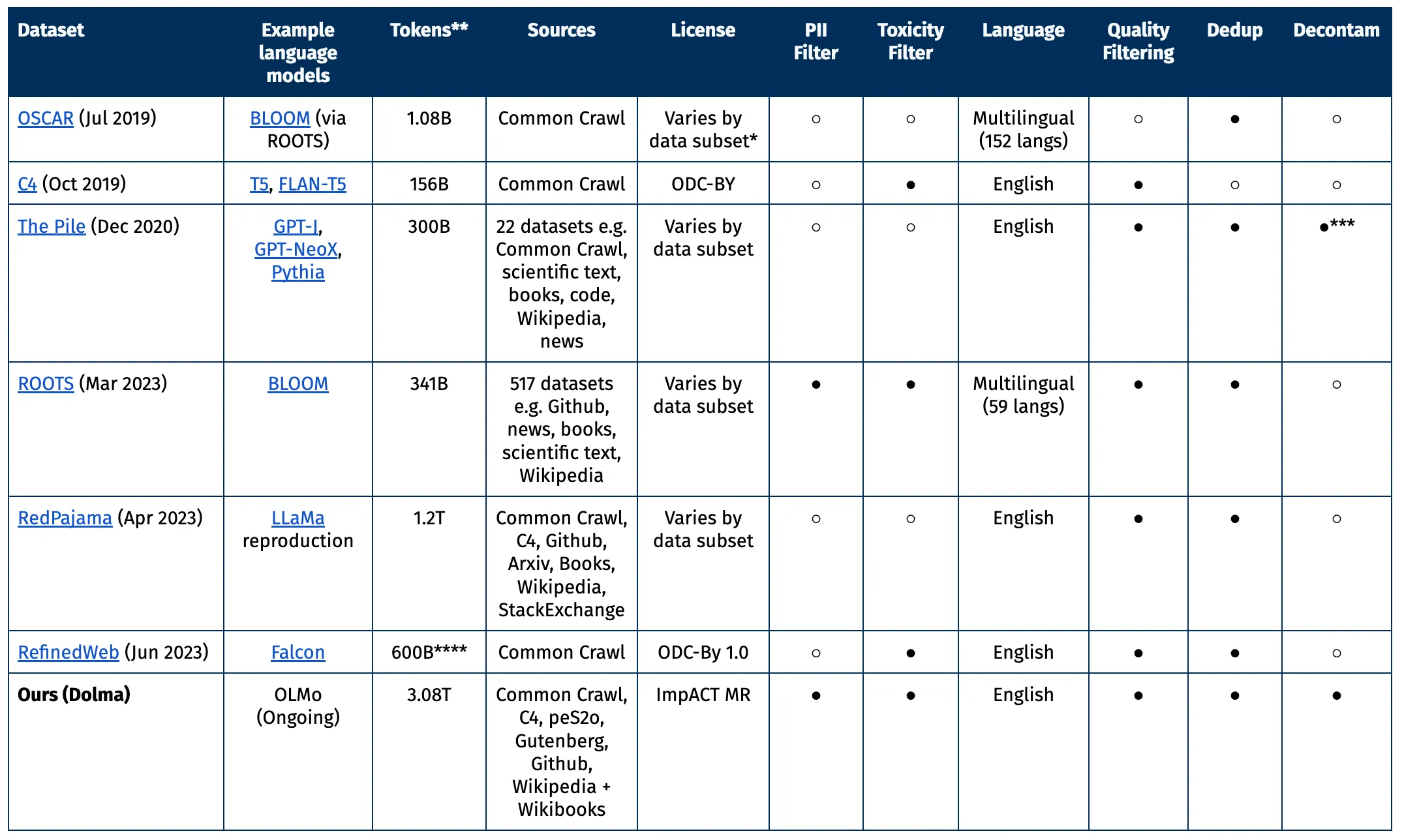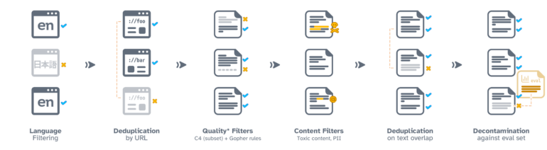 Ein Großteil des Datensatzes stammt aus dem gemeinnützigen Common-Crawl-Projekt, wobei der Fokus auf Webdaten liegt. Hinzu kommen weitere Webseiten aus der Sammlung C4, akademische Texte von peS20, Code-Schnipsel aus The Stack, Bücher aus Project Gutenberg und die englische Wikipedia.