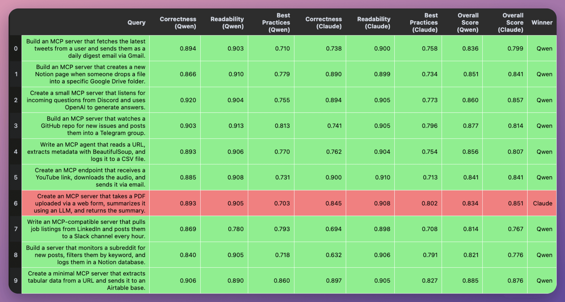 Die gute Leistung wird durch externe Tests bestätigt. X-Nutzer Avi Chavla hat Qwen3-Coder gegen Claude Sonnet 4 in mehreren Aufgaben systematisch gegeneinander antreten lassen. Bei zehn Problemstellungen, die die Entwicklung verschiedener Arten von MCP-Servern enthielten, trug Qwen in neun Fällen den Sieg nach Hause und zeigte durchgehend einen höheren Korrektheit-Wert.