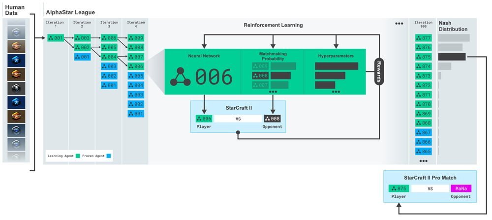 In einer Liga trainierten sich Alphastar-Varianten gegenseitig. Die effizienteste KI blieb übrig und besiegte anschließend menschliche Profis. Bild: Deepmind
