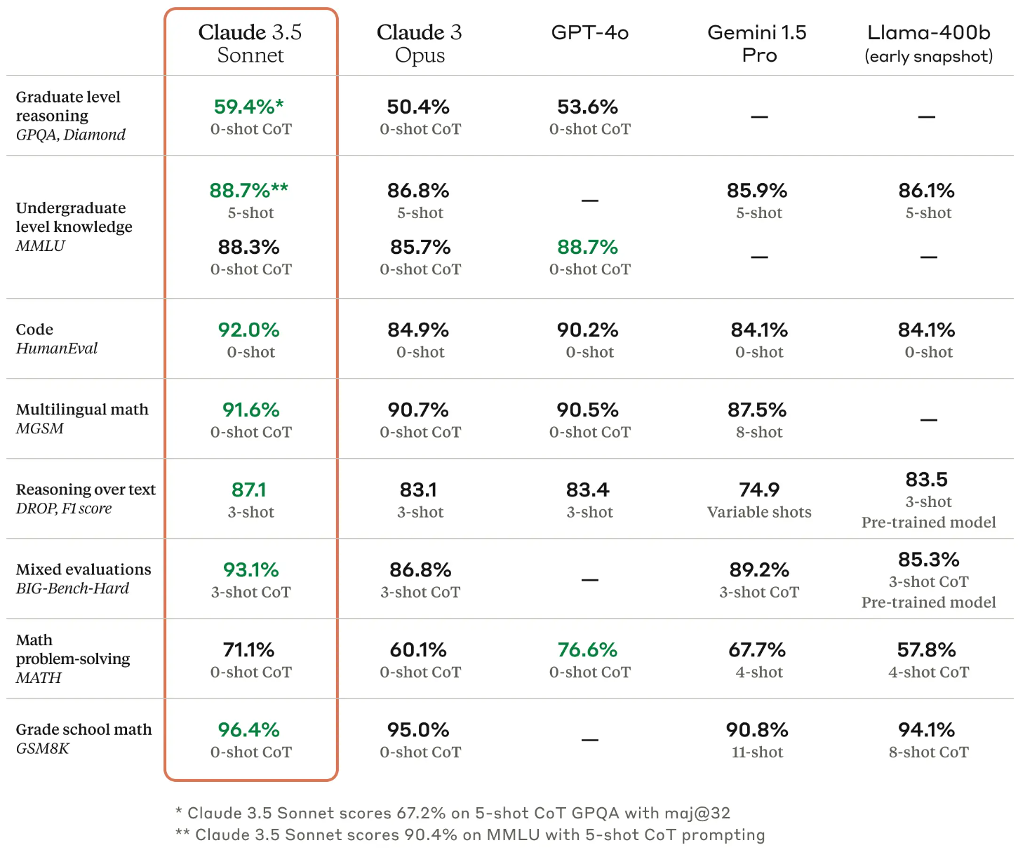Anthropic bezeichnet Claude 3.5 Sonnet als "Frontier Intelligence", die doppelt so schnell arbeitet wie Claude 3 Opus. Das Modell soll in Benchmarks neue Industriestandards für Reasoning auf Graduierten-Niveau (GPQA), Wissen auf Bachelor-Niveau (MMLU) und Kodierfähigkeiten (HumanEval) setzen.