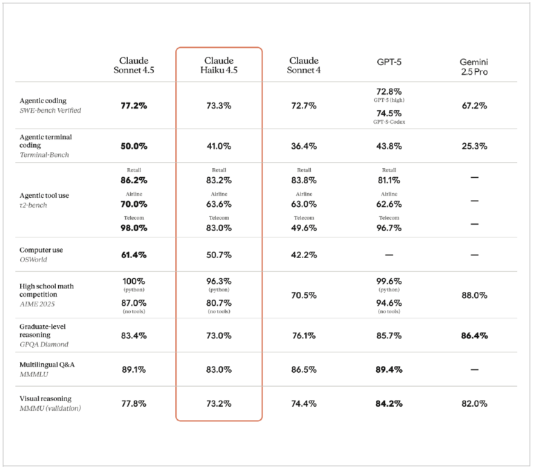 In Benchmarks für Tool-Nutzung (t2-bench) oder Terminal-Coding erreicht Haiku 4.5 Werte zwischen 41 % und 64 % und bewegt sich damit in der gleichen Leistungsklasse wie GPT-5 und Gemini 2.5 Pro. In mathematischen Aufgaben (AIME 2025) erreicht das Modell 96,3 % mit Python-Tools, 80,7 % ohne Hilfsmittel.