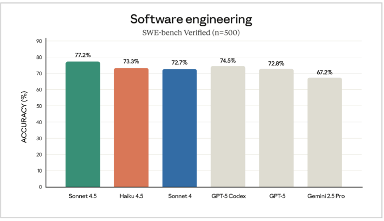 In programmierbezogenen Tests wie SWE-bench Verified liegt es mit 73,3 % knapp hinter Claude Sonnet 4.5 (77,2 %), aber über dem Wert des früheren Sonnet 4 (72,7 %).
