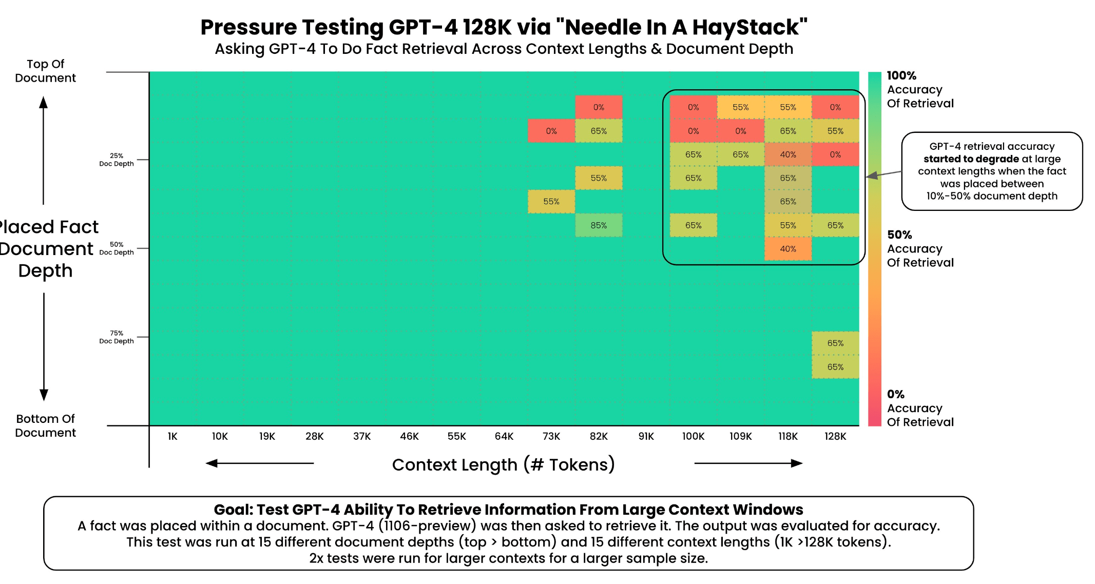 Die Performance von Claude 2.1 ähnelt der von OpenAIs GPT-4 Turbo, die Kamradt und andere schon früher untersucht hatten. Allerdings schnitt GPT-4 Turbo im gleichen Testverfahren besser ab als Claude 2.1, hat aber auch ein kleineres Kontextfenster.