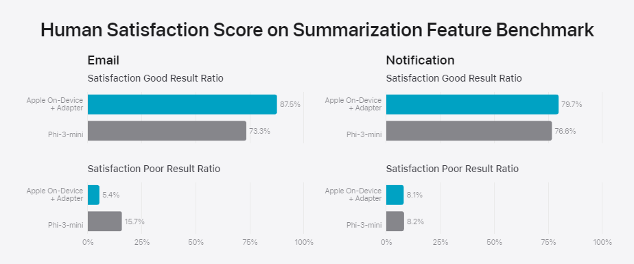 Bei Zusammenfassungen von E-Mails und Benachrichtigungen schlagen Apples On-Device-Modell mit Adapter Microsofts Phi-3-mini teils deutlich. Insbesondere die Anzahl schlechter E-Mail-Zusammenfassungen ist geringer.