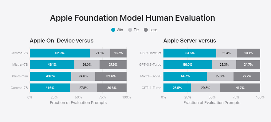 Das On-Device-Modell übertrifft mit etwa drei Milliarden Parametern größere Modelle wie Phi-3-mini, Mistral-7B und Gemma-7B. Das Server-Modell liegt gleichauf mit Modellen wie DBRX-Instruct, Mixtral-8x22B und GPT-3.5-Turbo, und ist dabei laut Apple sehr effizient.