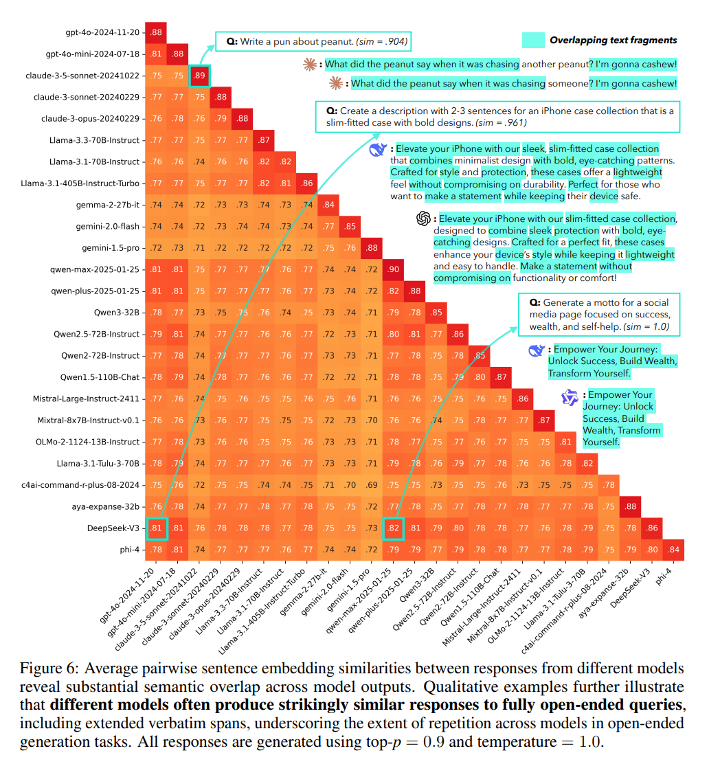 Um diesen Effekt zu messen, führt das Team Infinty-Chat ein, einen Datensatz von echten Nutzeranfragen. Die quantitativen Befunde sind deutlich: Bei fast vier von fünf getesteten Fällen sind die Antworten desselben Modells einander so ähnlich, dass sie sich kaum noch unterscheiden. Die Studie dokumentiert jedoch auch wörtliche Überlappungen zwischen unterschiedlichen Modellfamilien.