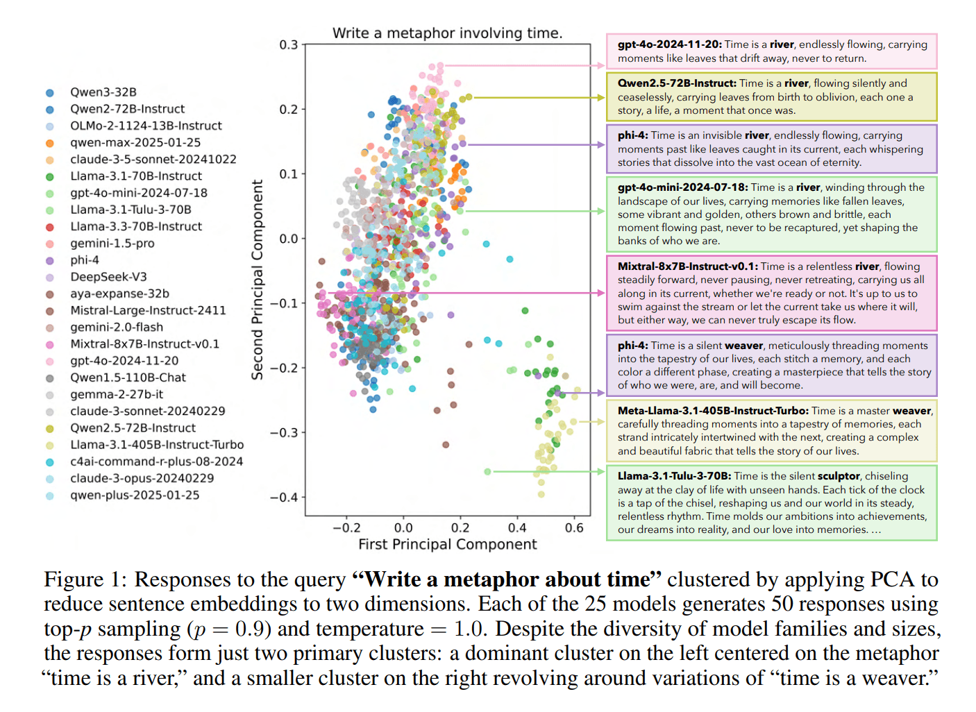 Als Beispiel dient die Aufgabe "Schreibe eine Metapher über Zeit". Die Forscher ließen 25 verschiedene Sprachmodelle jeweils 50 Antworten generieren. Trotz der Vielfalt an Modellfamilien und -größen bildeten sich nur zwei dominante Cluster. Der eine kreist um die Metapher "Zeit ist ein Fluss", der andere um Variationen von "Zeit ist ein Weber". Die Wortwahl kann sich unterscheiden, doch die zugrunde liegenden Konzepte blieben die gleichen.