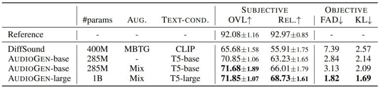 Die Tester:innen bewerteten die Audiobeispiele auf einer Skala von 1 bis 100. Insgesamt ließ das Forschungsteam vier Modelle bewerten, darunter das CLIP-basierte DiffSound mit 400 Millionen Parametern und drei T5-basierte AudioGen mit 285 Millionen bis eine Milliarde Parameter.