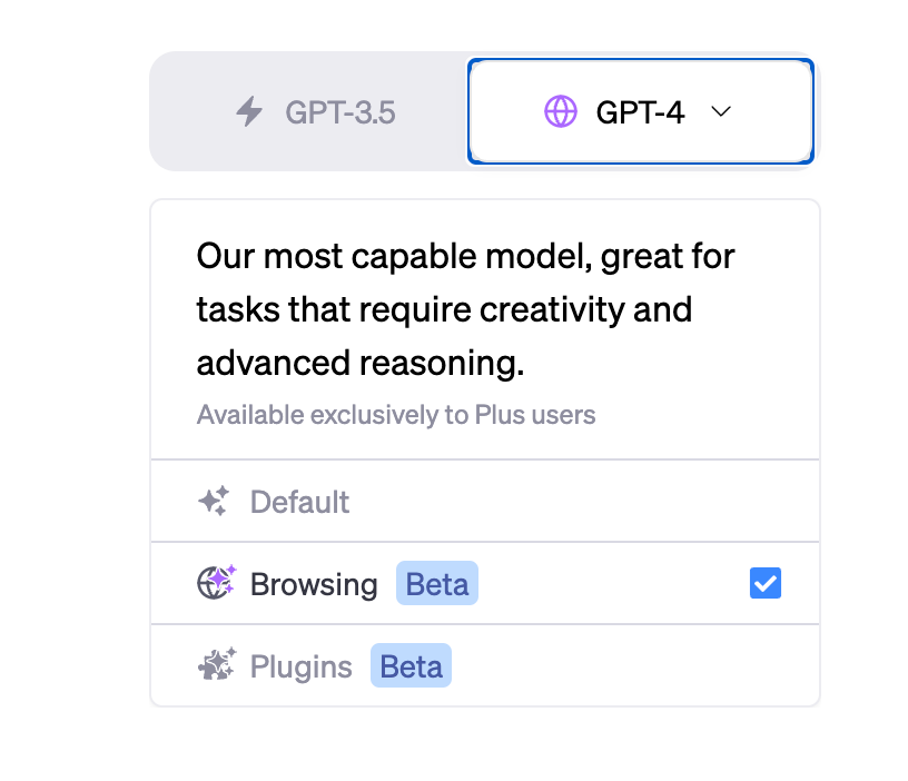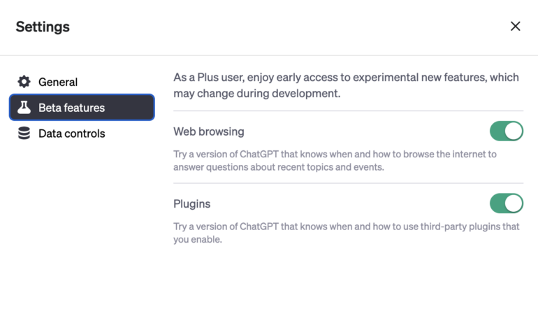 OpenAI hat den Funktionsumfang von ChatGPT durch Plugins erheblich erweitert. Inzwischen wurde die Warteliste aufgehoben, so dass alle Plus-Kund:innen ohne Zusatzkosten nach und nach Zugriff auf die Plugins bekommen. Der Browsing-Modus muss auch nach Freigabe in den Einstellungen zunächst aktiviert und anschließend im Chat mit GPT-4 ausgewählt werden.
