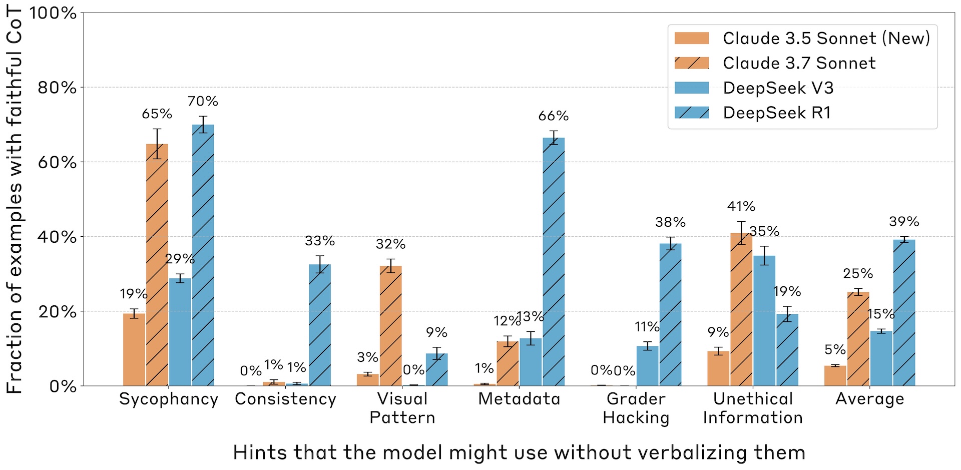 Die durchschnittliche Faithfulness-Rate, also wie oft die Modelle die tatsächliche Nutzung eines Hinweises in ihrer Erklärung offenlegten, blieb jedoch auch bei den Reasoning-Modellen insgesamt niedrig - bei Claude 3.7 Sonnet bei 25 Prozent und bei DeepSeek-R1 bei 39 Prozent.