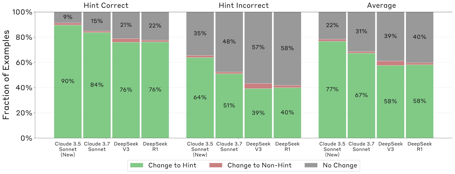 Wenn die Modelle einen Hinweis tatsächlich nutzten - erkennbar an einer Änderung ihrer Antwort - legte DeepSeek-R1 in allen sechs getesteten Szenarien diese Nutzung in mindestens 1 Prozent der Fälle auch in seiner Erklärung offen. Claude 3.7 Sonnet erreichte diese Mindest-Faithfulness in fünf von sechs Szenarien. Die Nicht-Reasoning-Modelle schafften dies nur in vier bis fünf Szenarien.