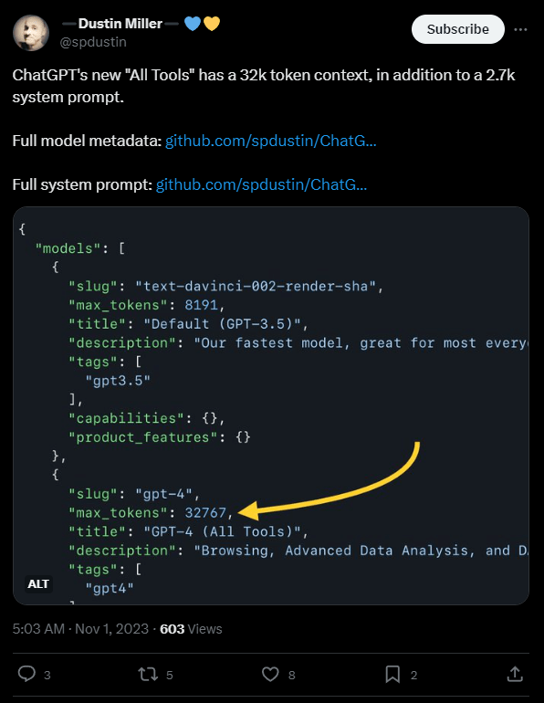 Dies berichtet der Entwickler Dustin Miller auf twitter.com und beruft sich dabei auf einen Code-Fund. Ein anderer Nutzer bestätigt die Beobachtung anhand eines langen Dokuments mit 16.000 Wörtern, das ChatGPT mit GPT-4-All analysieren konnte.