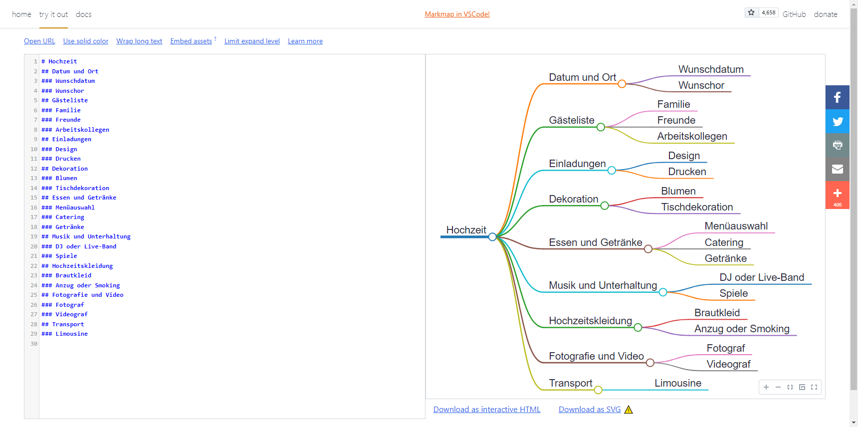 Basierend auf der Hierarchie der jeweiligen Überschrift stellt die Webseite den eingegebenen Text als Mindmap dar und unterstützt sogar weitere Formatierungen der einzelnen Einträge, etwa für Code oder Formeln. Die Grafik kann anschließend entweder als interaktive Webseite in HTML oder als Vektorgrafik im SVG-Format heruntergeladen werden.