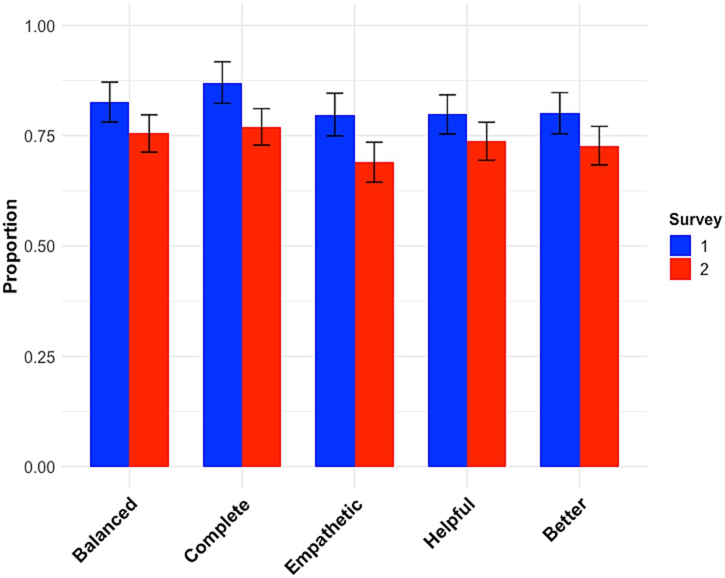 Die Studie zeigte auch, dass die Antworten der ChatGPT-Teilnehmer länger waren als die der Ratgeber-Kolumnisten. In einer zweiten Studie kürzten die Forschenden daher die Antworten der ChatGPT-Teilnehmer auf etwa die gleiche Länge wie die der Ratgeber-Kolumnisten. Diese zweite Studie bestätigte die ersten Ergebnisse, wenn auch auf etwas niedrigerem Niveau, und zeigte, dass der Vorteil von ChatGPT nicht allein auf ausführlichere Antworten zurückzuführen ist.