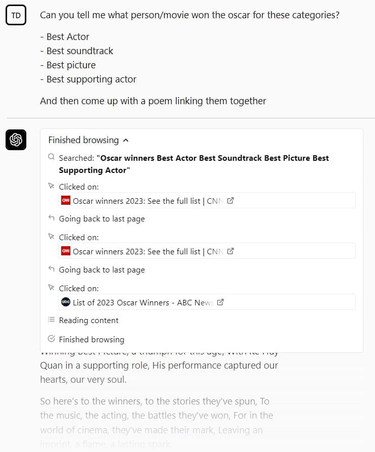 Das Web-Browsing-Plugin basiert auf der Arbeit mit WebGPT. Es kann über Microsofts Bing in Echtzeit Informationen aus dem Internet abrufen und "diskutieren", wie OpenAI es nennt.