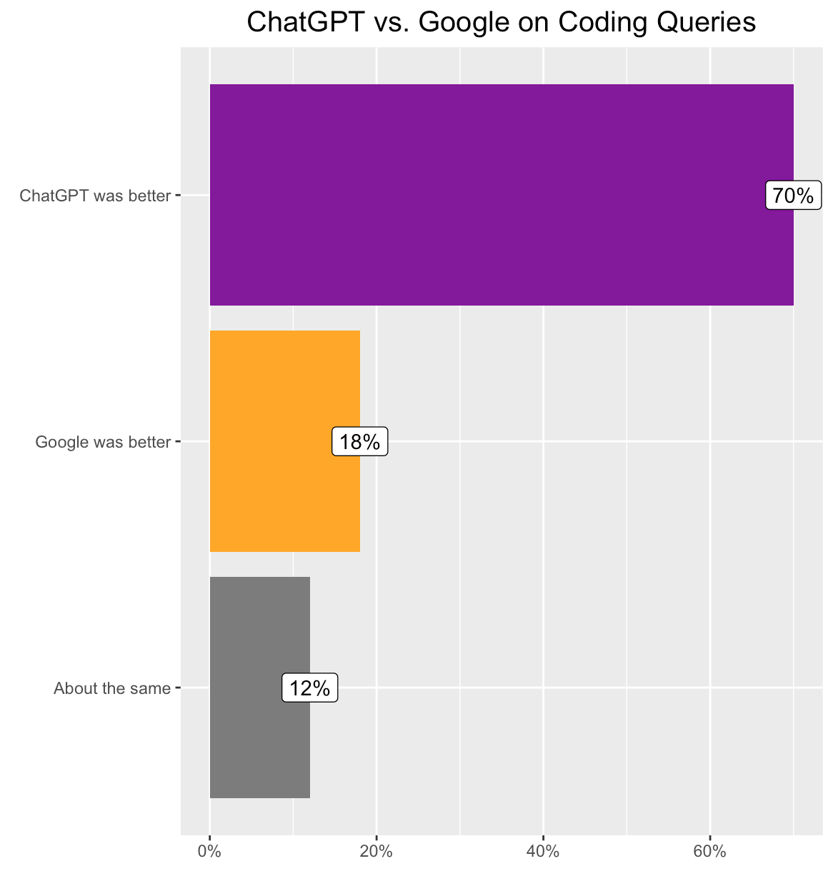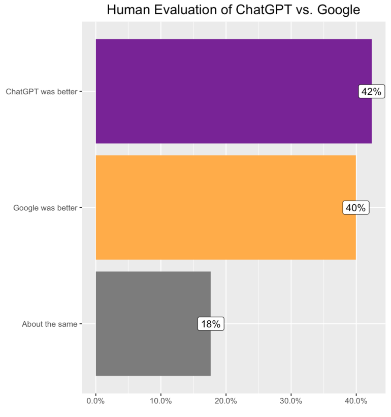 Die Mitarbeitenden stellten ihre Anfrage erneut an Google und als Gesprächsaufforderung an ChatGPT. Die Resultate und Antworten bewerteten sie dann: In 42 Prozent der Fälle hatte ChatGPT die Nase vorn, in 40 Prozent Google - obwohl ChatGPT nicht für die Suche optimiert ist.