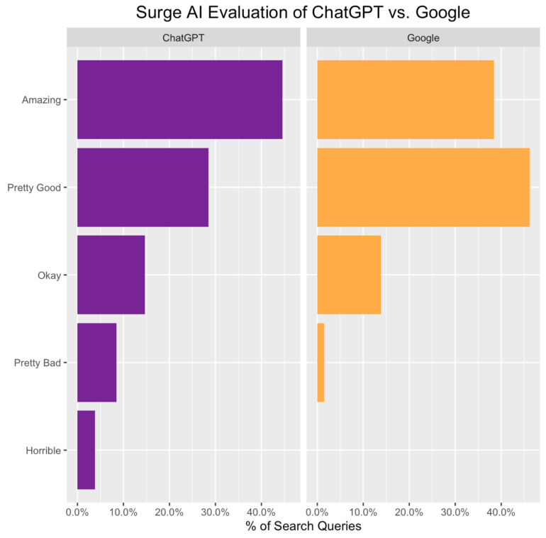 Die Data-Labeling-Plattform "Surge" hat die Ergebnisse von Google und ChatGPT bei 500 Suchanfragen verglichen - und bezeichnet ChatGPT als "existenzielle Bedrohung" für Google.
