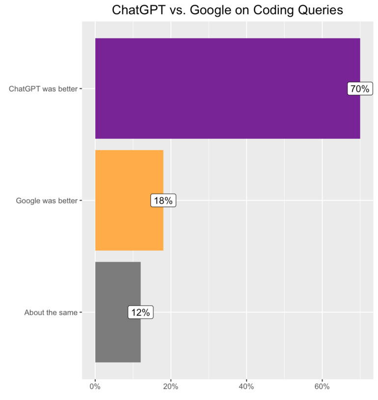 Insbesondere bei Code-Anfragen soll ChatGPT überlegen sein, da es direkt den konkreten Code ausspielt statt Links zu Webseiten, die den passenden Code enthalten - oder auch nicht.