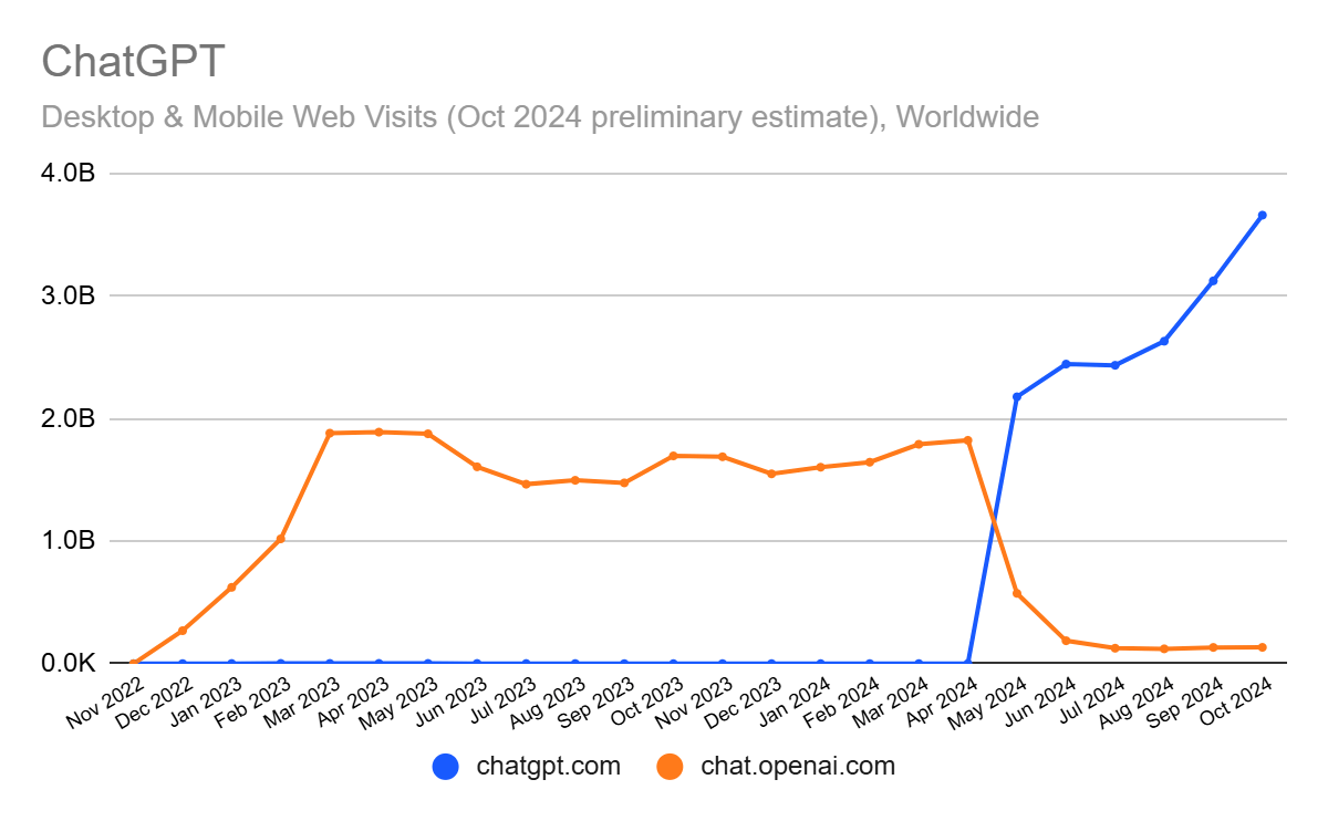 Nach vorläufigen Schätzungen von Similarweb erreichte ChatGPT im Oktober einen neuen Rekord mit 3,7 Milliarden weltweiten Besuchen. Das entspricht einem Plus von 17,2 Prozent zum Vormonat und einem Zuwachs von 115,9 Prozent im Jahresvergleich.