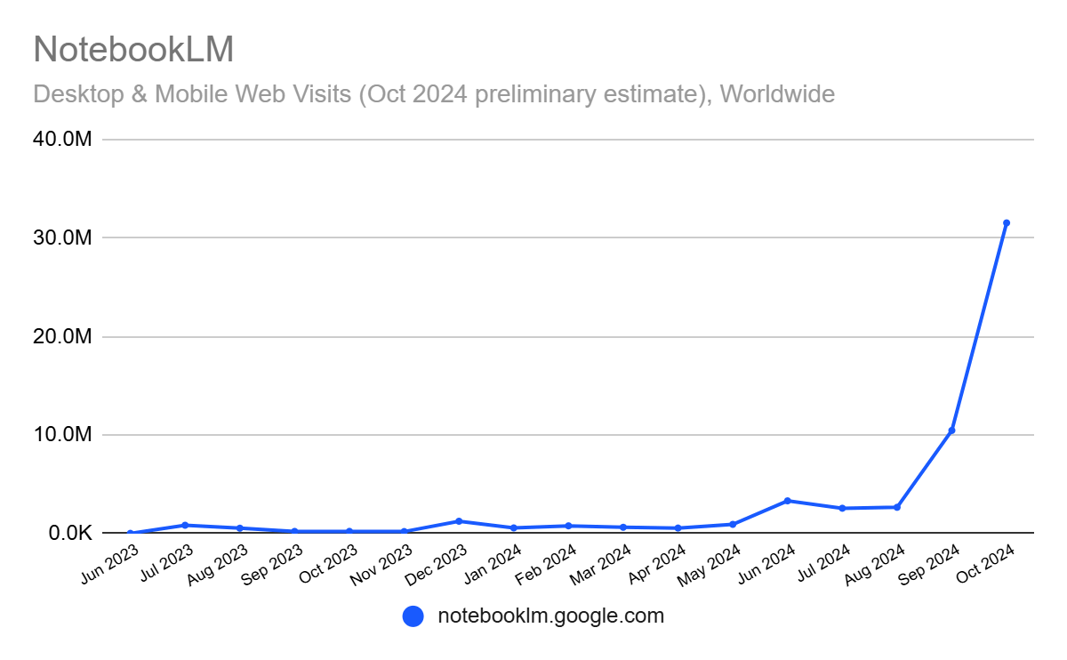 Noch stärker wächst Googles NotebookLM: Der schon im Juli 2023 gestartete Dienst verzeichnete im Oktober ein Wachstum von über 200 Prozent auf 31,5 Millionen Besuche - der zweite Monat in Folge mit dreistelligem Wachstum.