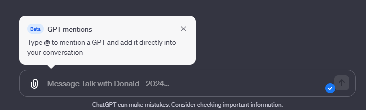 Durch "@"-Erwähnungen des Namens eines GPTs können diese im selben Chatfenster aufgerufen werden. Auf diese Art kann man sich einen individuelleren, universelleren Assistenten im selben Chatfenster einrichten, der die Antworten und damit die Fähigkeiten der einzelnen GPTs miteinander in Beziehung setzen kann.