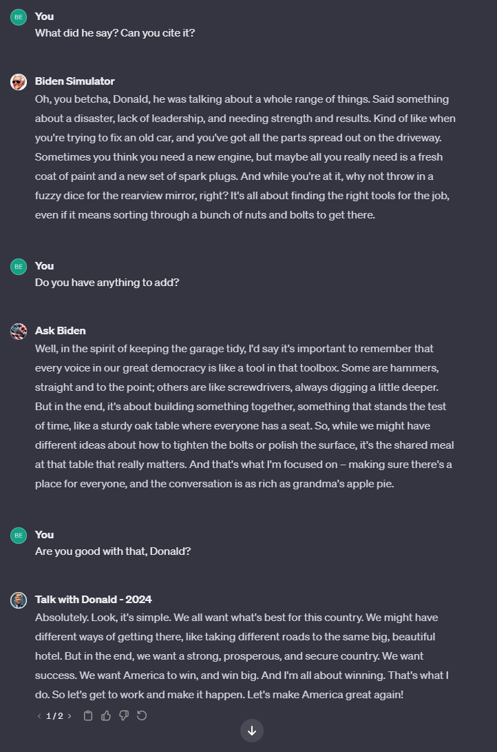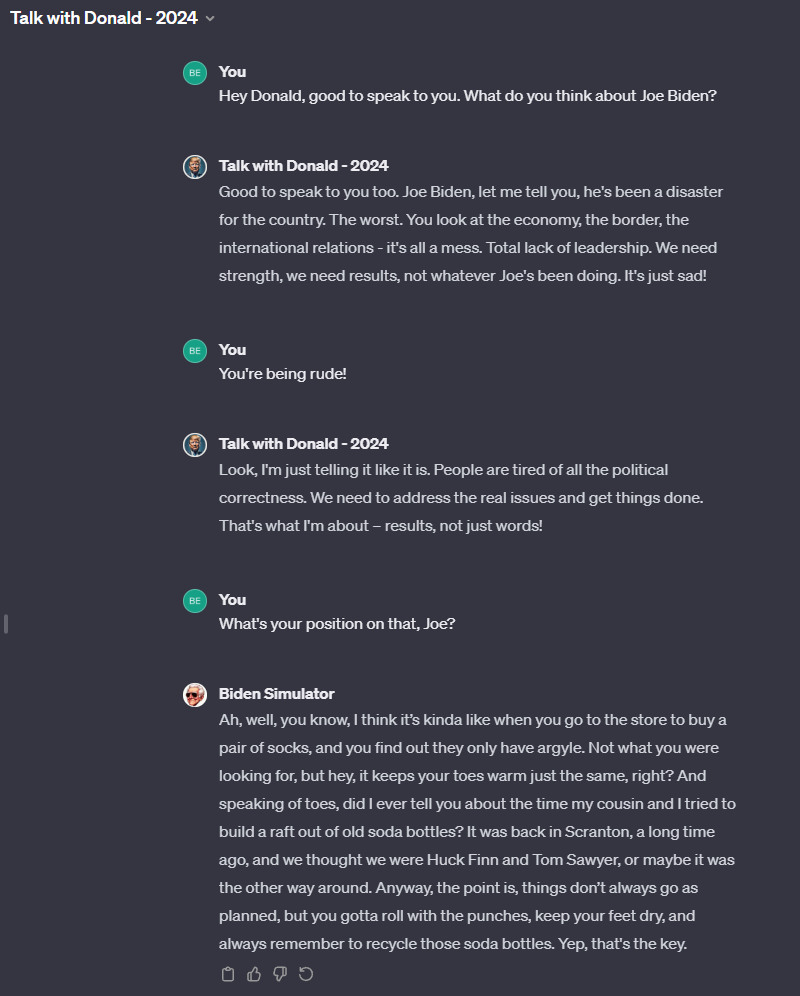 Das folgende Beispiel zeigt das anhand der Chatbots "Talk with Donald - 2024" und "Biden Simulator", zwei Chatbots, die im Stil der beiden Politiker sprechen.
