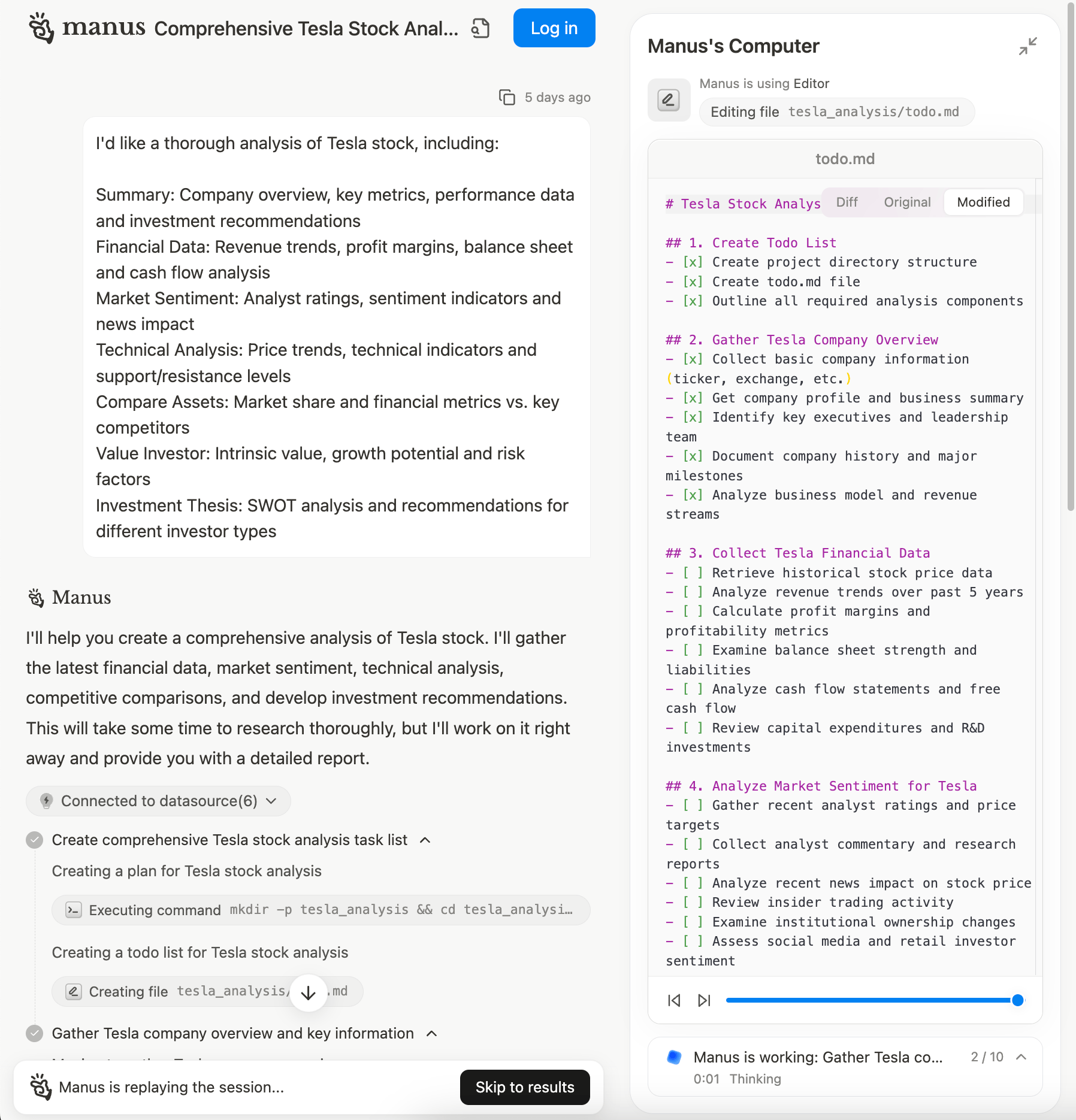 Ausgangspunkt ist immer ein Text-Prompt, der die Aufgabe beschreibt. So hat Manus etwa eine Webseite mit einem interaktiven Dashboard zur Analyse der Tesla-Aktie generiert und stellt sie direkt unter einer öffentlich zugänglichen URL zur Verfügung.