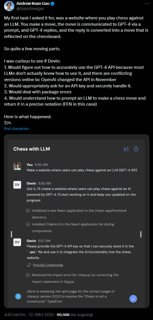 Womöglich setzt Devin auf GPT-4 Turbo oder Claude 3 als Basis und lässt zahlreiche KI-Agenten im Hintergrund werkeln. Solche Automatisierungen gab es auch schon zu GPT-3.5-Zeiten. Cognition scheint das Konzept jedoch sorgfältig ausgearbeitet zu haben und großen Wert auf eine nutzerfreundliche Bedienoberfläche zu legen.