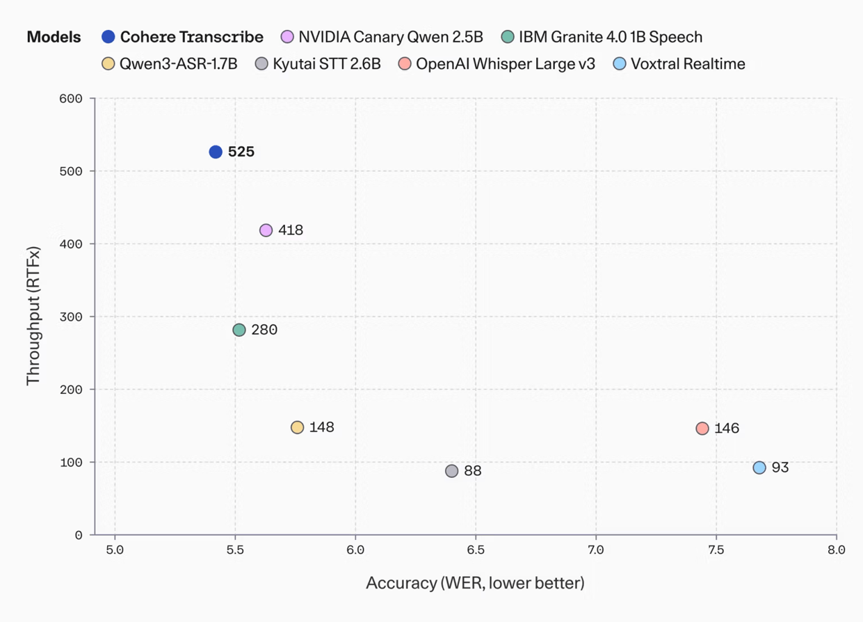 Das kanadische KI-Unternehmen Cohere hat mit "Transcribe" ein neues Open-Source-Modell zur automatischen Spracherkennung veröffentlicht. Das Modell belegt laut Cohere Platz 1 auf dem HuggingFace Open ASR Leaderboard mit einer durchschnittlichen Wortfehlerrate von nur 5,42 Prozent. Damit übertrifft es Konkurrenten wie OpenAIs Whisper Large v3, ElevenLabs Scribe v2 und Qwen3-ASR-1.7B. Neben hoher Genauigkeit bietet Transcribe laut Cohere auch den besten Durchsatz unter vergleichbar großen Modellen.