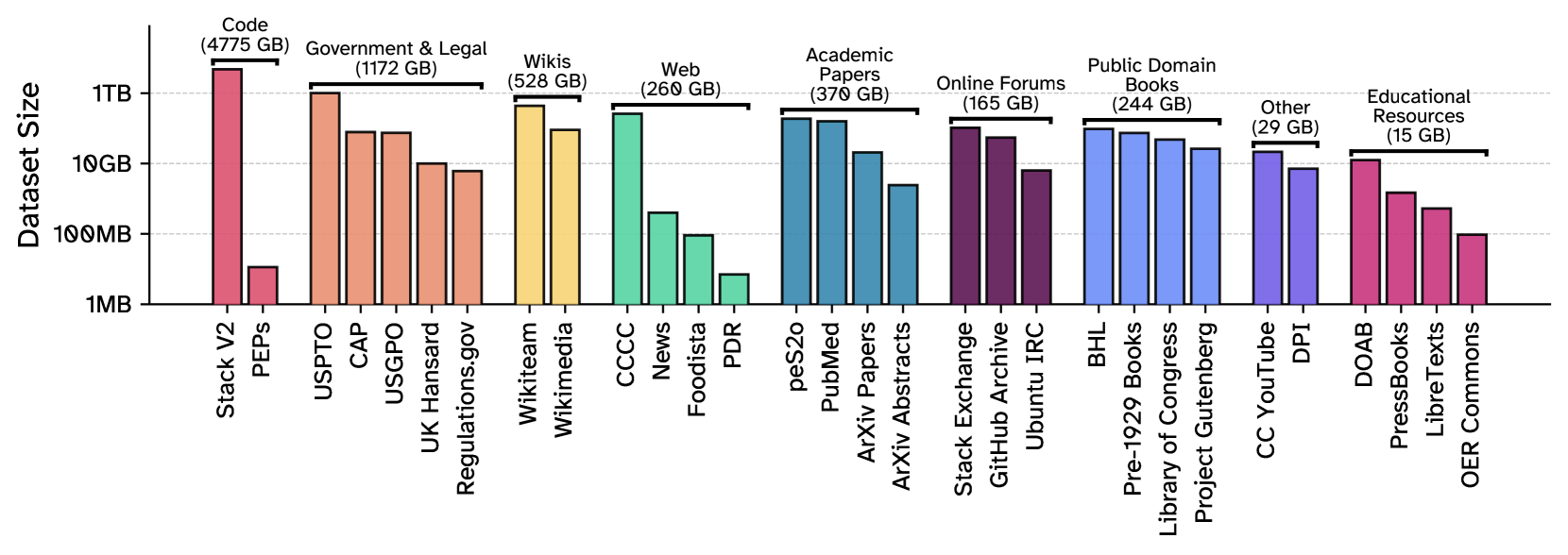 Dazu gehören wissenschaftliche Artikel und Abstracts des Pre-Print-Servers Arxiv, medizinische Texte aus PubMed Central sowie mehrere Millionen wissenschaftliche Publikationen. Ebenfalls enthalten sind juristische Texte wie US-Patente, Gesetzestexte vom US Government Publishing Office, Gerichtsurteile aus dem Caselaw Access Project sowie Debattenprotokolle des britischen Parlaments. Weitere Bestandteile sind Bücher aus dem Project Gutenberg oder der Library of Congress sowie freie Lern- und Lehrmaterialien.