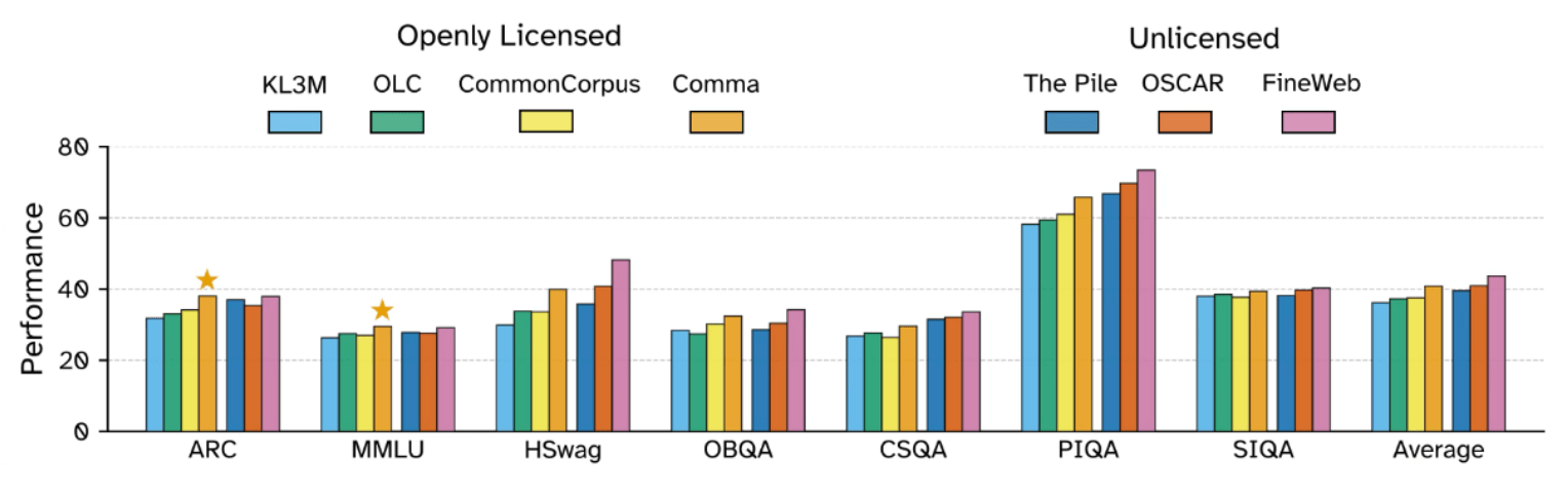 Das FineWeb-Dataset, das stark gefilterte Webinhalte enthält, erreichte bei den meisten Tests die besten Werte. Allerdings basiert FineWeb ebenfalls nicht ausschließlich auf offen lizenzierten Quellen.
