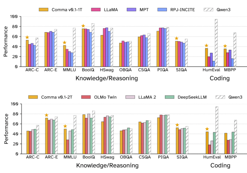 Comma v0.1-1T schnitt in vielen dieser Tests besser ab als Modelle mit ähnlicher Parameterzahl und ähnlichem Trainingsbudget wie Llama-1-7B, StableLM-7B oder OpenLLaMA-7B, die auf unlizenzierten Daten trainiert wurden. Besonders großen Vorsprung hatte das Modell bei wissenschaftlichen Aufgaben und Programmiertests.