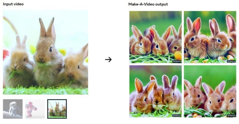 Von vorhandenen Videos kann Make-a-Video Varianten erzeugen, die sich Motiv und der Animation des Originals annähern, sich aber letztlich in Details deutlich unterscheiden.