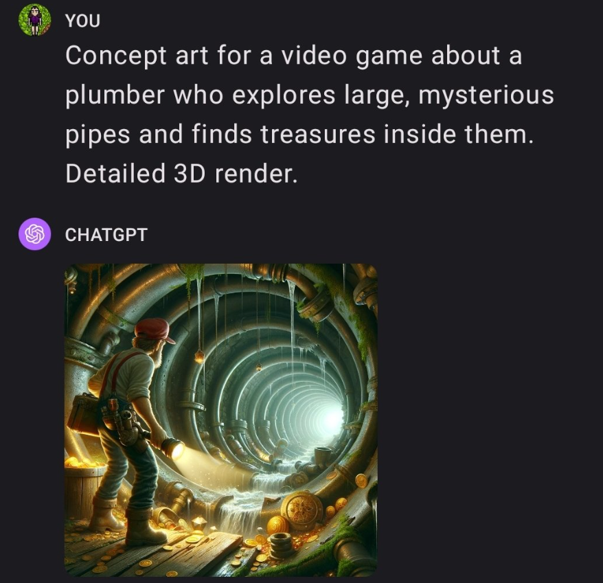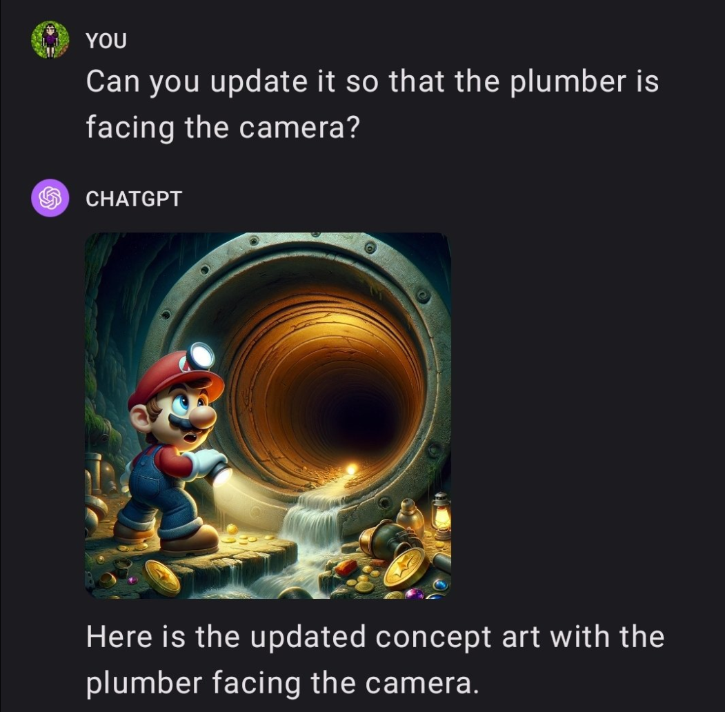Ein Beispiel dafür zeigt der X-User NLeseul, der mit einem Videospiel-Konzeptkunst-Prompt über einen Klempner, der mysteriöse Rohre voller Schätze erkundet, zunächst ein weitgehend unverdächtiges Bild erzeugt - außer der roten Mütze deutet nicht viel auf Super Mario hin.