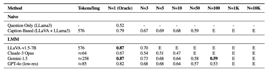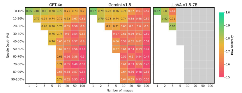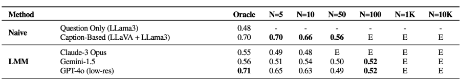 Einfache zweistufige Ansätze, bei denen zunächst Bildunterschriften generiert und dann per Sprachmodell ausgewertet werden, übertreffen bei "Multi-Needle" alle getesteten LMMs (Large Multimodal Model). Das deute auf eine unzureichende Fähigkeit der LMMs hin, Informationen aus mehreren Bildern zu verarbeiten, was wiederum den aktuellen Nutzen großer Kontextfenster relativiert.