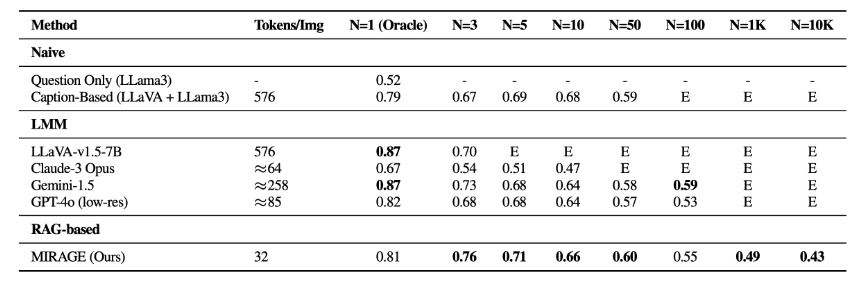 Das Forschungsteam hat ein für die Bildverarbeitung optimiertes RAG-System namens MIRAGE (Multi-Image Retrieval Augmented Generation) entwickelt. Es komprimiert visuelle Token, verwendet einen gemeinsam trainierten Retriever, um irrelevante Bilder herauszufiltern, und wird mit Multi-Image-Reasoning-Daten trainiert. Auf diese Weise erreicht es eine bessere Leistung sowohl bei VHs als auch bei komplexeren Aufgaben zur Beantwortung visueller Fragen.