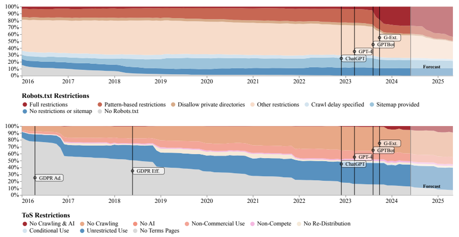 Die Beschränkungen gehen vorwiegend von Nachrichtenwebsites, Foren und Social-Media-Plattformen aus. Bei Nachrichtenseiten stieg der Anteil vollständig gesperrter Tokens innerhalb eines Jahres von drei Prozent auf 45 Prozent. Deren Anteil in den Trainingsdaten dürfte daher zugunsten von Unternehmens- und E-Commerce-Websites, die weniger Restriktionen aufweisen, sinken.