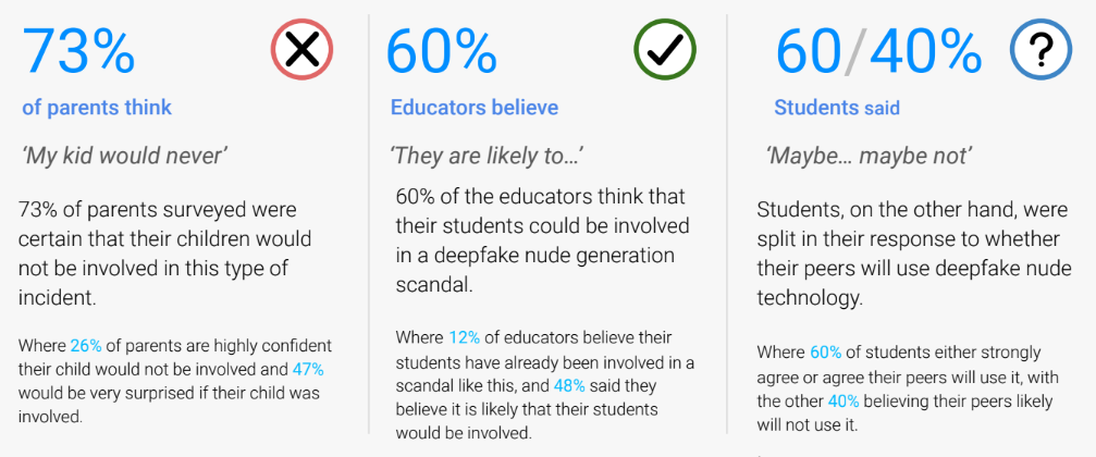 Die Studie zeigt, dass die meisten Eltern vollkommen ahnungslos sind. 73 Prozent der befragten Eltern waren sich sicher, dass ihre Kinder niemals in einen Deepfake-Skandal involviert sein würden. Im Gegensatz dazu glauben 60 Prozent der Lehrer, dass ihre Schüler möglicherweise involviert sein könnten.