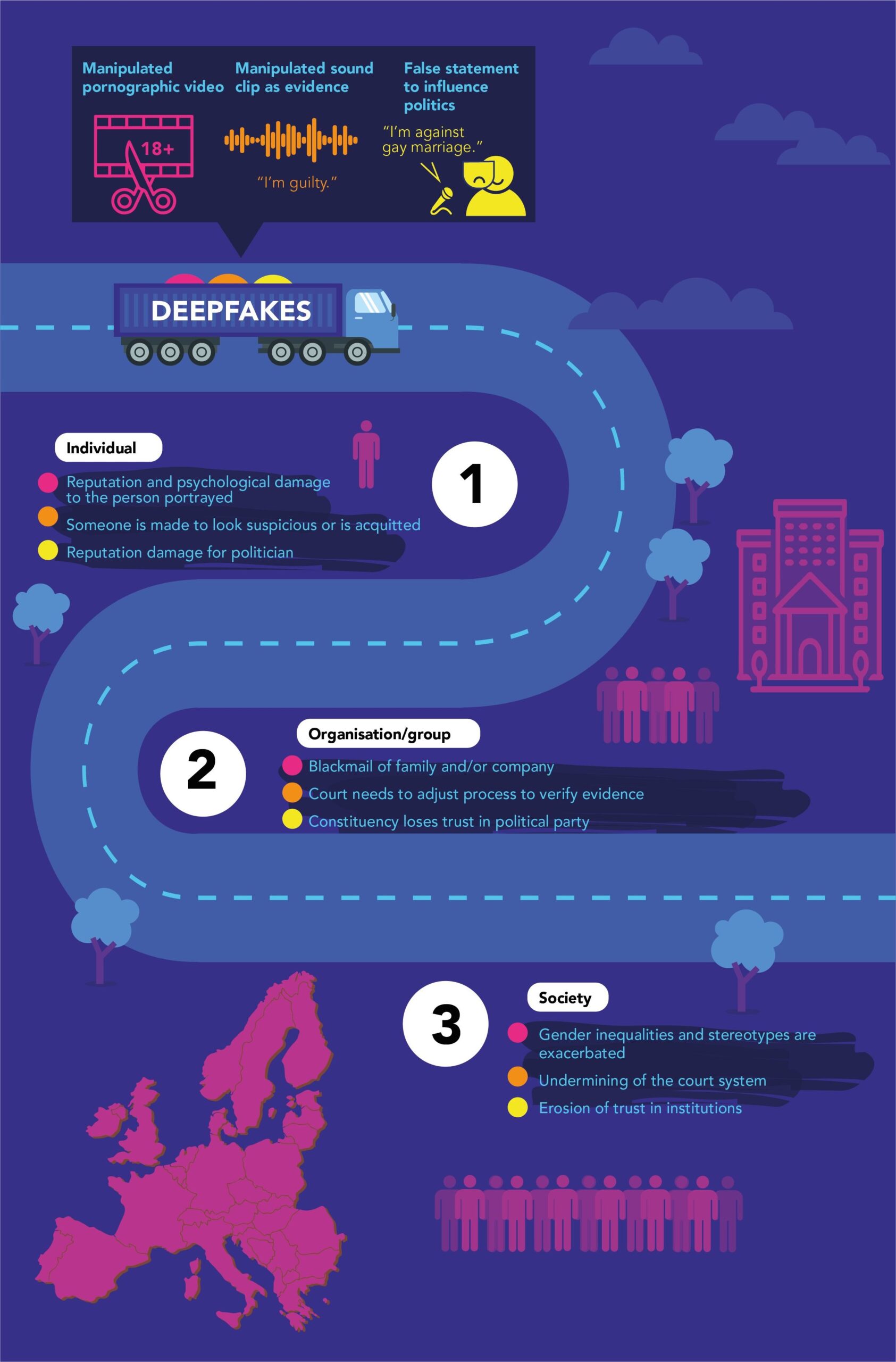 Die Forschenden stellen Deepfake-Risiken im Kontext gefälschter pornografischer Inhalte heraus, die fast ausschließlich Frauen betreffen, bei manipulierten Audio-Clips etwa für gefälschte Schuldeingeständnisse oder bei falschen Video-Statements von Politiker:innen, die etwa in sozialen Netzwerken zirkulieren.