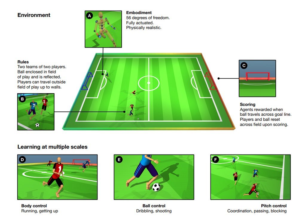 In einer neuen Forschungsarbeit von Deepmind spielen vier KI-Agenten gegeneinander Fußball. Die Besonderheit ist, dass sie das Fußballspiel von der Pi(c)ke auf gelernt haben und dabei verschiedene Fähigkeiten miteinander verbinden.