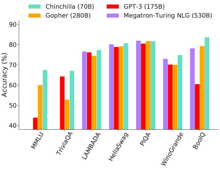Während in den letzten Jahren der Fokus von KI-Forschenden auf mehr Parametern für bessere Leistung lag, reduzierte Deepmind für Chinchilla die Netzwerkgröße und skalierte stattdessen die Anzahl der Trainingsdaten deutlich nach oben. Da beim KI-Training die benötigte Rechenleistung von der Modellgröße und den Trainingstoken abhängt, blieb sie auf dem Niveau des ebenfalls von Deepmind veröffentlichten Gopher.