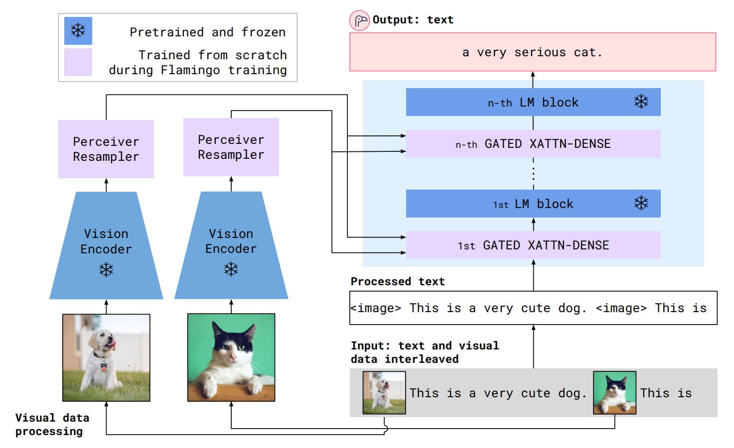 Flamingo verbindet einen mit Bildern und Text trainierten ResNet-Encoder mit einer Variante von Deepminds Sprachmodell Chinchilla. Die Verbindung wird durch Deepminds Perceiver ermöglicht, der die Ausgabe des visuellen Modells verarbeitet und an Attention-Layer vor dem Sprachmodell weitergibt.