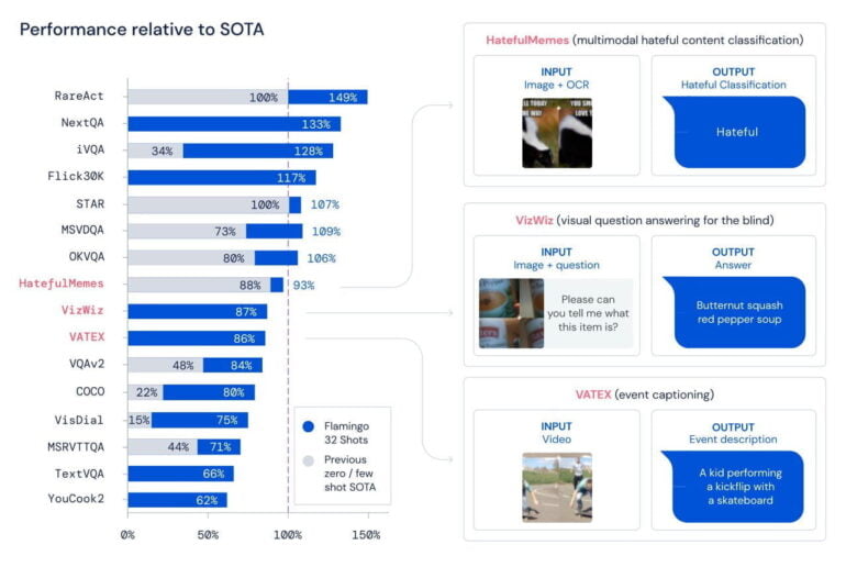 In 16 getesteten Bildverständnis-Benchmarks schlägt Flamingo andere Few-Shot-Ansätze. In diesen Tests muss Flamingo etwa Hatespeech auf Memes erkennen, Objekte identifizieren und beschreiben oder Ereignisse in einem Video benennen.