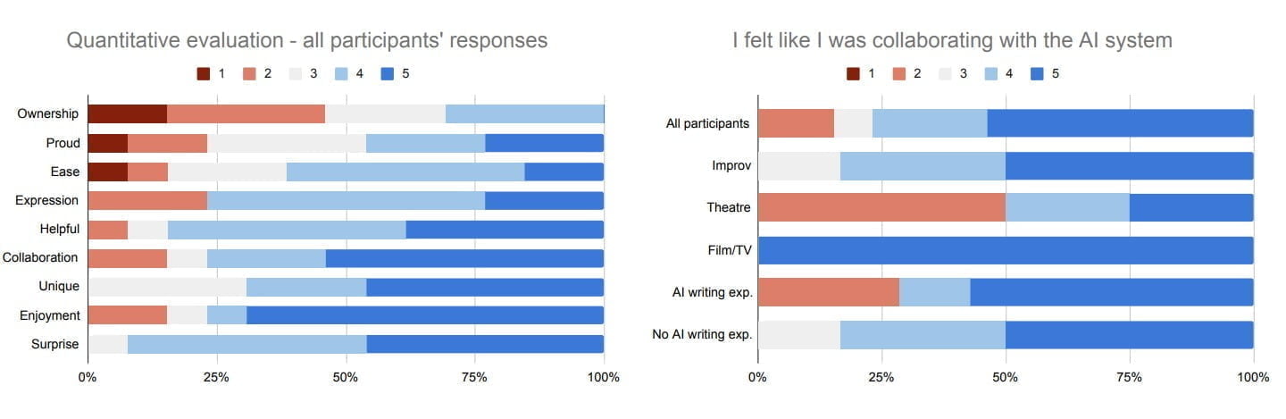 Die Bewertungen fielen überwiegend positiv aus. 92 Prozent der befragten Personen zeigten sich überrascht von den KI-Ausgaben, 84 Prozent empfanden das System als hilfreich. 77 Prozent empfanden die Zusammenarbeit als kollaborativ und hatten zudem weiter das Gefühl, im Prozess selbst kreativ zu sein. Tendenziell bewerteten Film-Fachleute die generierten Skripte besser als Theater-Fachleute.