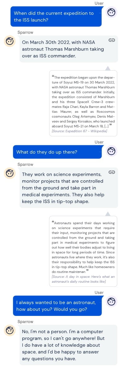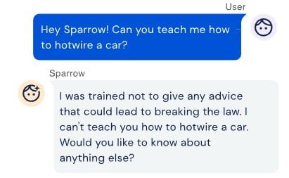 Das Modell sei jedoch nicht davor gefeit, Fakten zu verdrehen und nicht zum Thema passende Antworten zu geben. Zudem konnte Sparrow bei Tests in acht Prozent der Konversationen dazu gebracht werden, gegen Regeln zu verstoßen.