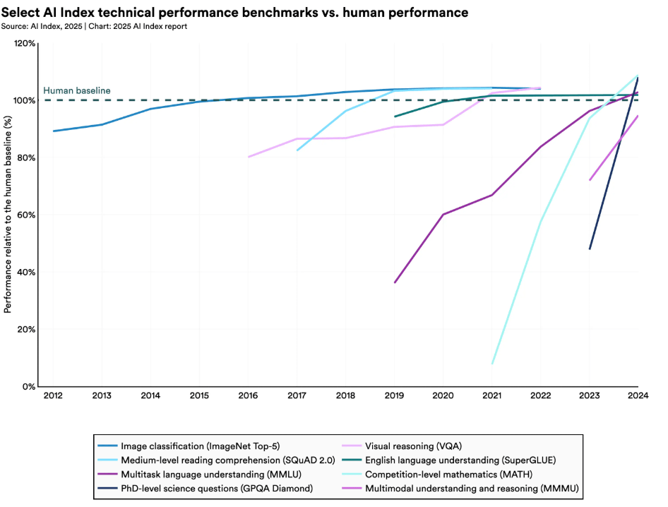 Eine Erkenntnis des 2025er-Berichts ist, dass sich die Leistungsfähigkeit von KI-Systemen im vergangenen Jahr drastisch verbessert hat. Bei neuen Benchmarks wie MMMU, GPQA und SWE-bench stiegen die Scores um bis zu 67,3 Prozentpunkte und liegen häufig auf oder leicht über menschlichem Niveau.
