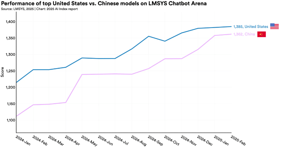 Der Bericht beschreibt jedoch auch das Deepseek-Phänomen: Die Leistungslücke zwischen chinesischen und amerikanischen Modellen schließt sich zusehends. Während der Unterschied Anfang 2024 noch im zweistelligen Prozentbereich lag, seien die Modelle mittlerweile fast auf Augenhöhe. Zudem holen Open-Source-Modelle auf proprietäre Modelle auf.
